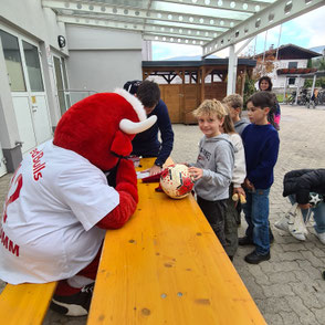Am 13. und 14.10. besuchte uns die "Red-bull-Fußballschule". Die drei Trainer aus Salzburg trainierten mit den Kindern der 2. bis 4. Klassen jeweils eine Stunde im Turnsaal. Die Kinder hatten großen Spaß dabei! Der Höhepunkt für die Kinder war der Besuch von "Bulli", dem Supermaskottchen von Red-bull- Salzburg! Bulli unterschrieb alle mitgebrachten Sportsachen und Bälle der Kinder. Jedes Kind bekam auch noch eine tolle Autogrammkarte. Wir bedanken uns sehr herzlich bei den drei tollen und engagierten Trainern und natürlich bei Bulli! Weiter...